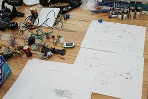 One group constructed an electric car. They brought in wheels, a 9-volt battery, and some wires from home and found towels, hot glue, cardboard, aluminum foil, and some other supplies in the classroom. By soldering and connecting the wires and lots of trial and error, they got it to move!